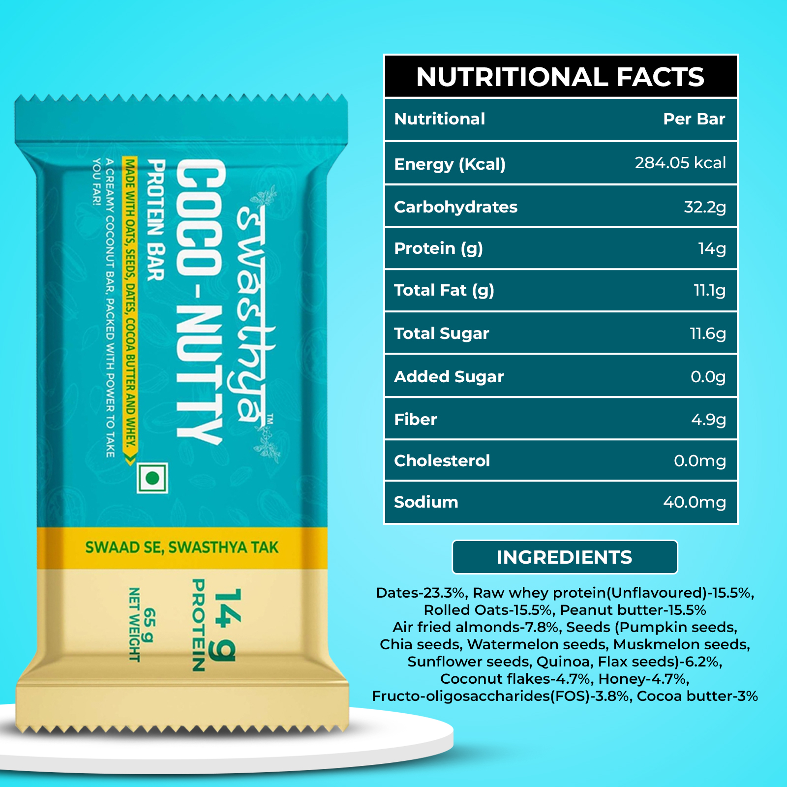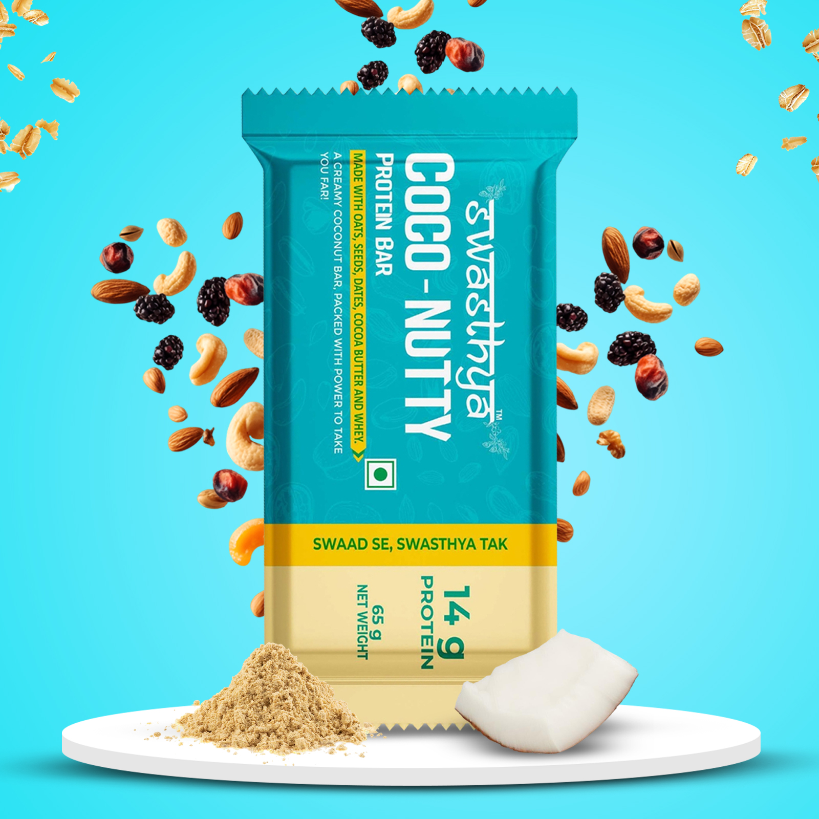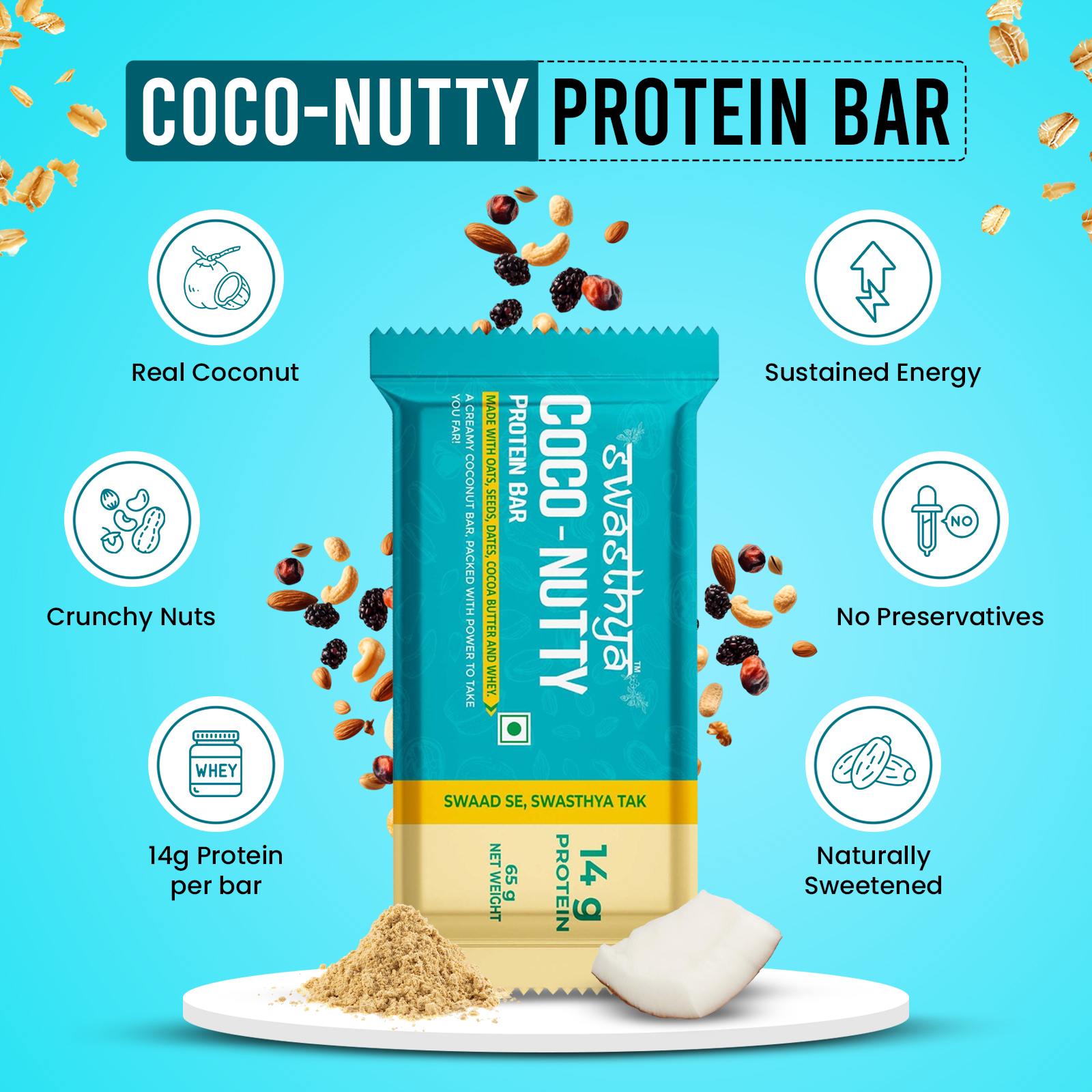 Fuel your day with the wholesome goodness of Coco-Nutty Protein Bars, crafted with real coconut, crunchy nuts, and high-quality each bar gives you 14g protein. These bars are naturally sweet, preservative-free, and made without refined sugar, making them a guilt-free choice for fitness lovers and busy lifestyles alike. Each bar delivers sustained energy and rich flavour, perfect for post-workout boosts, on-the-go munching, or satisfying mid-day cravings. Packed in a convenient box of 6, they’re easy to carry and enjoy anytime, anywhere. Choose Coco-Nutty Protein Bars for a tasty, nutritious snack that supports your wellness journey without compromising on taste.