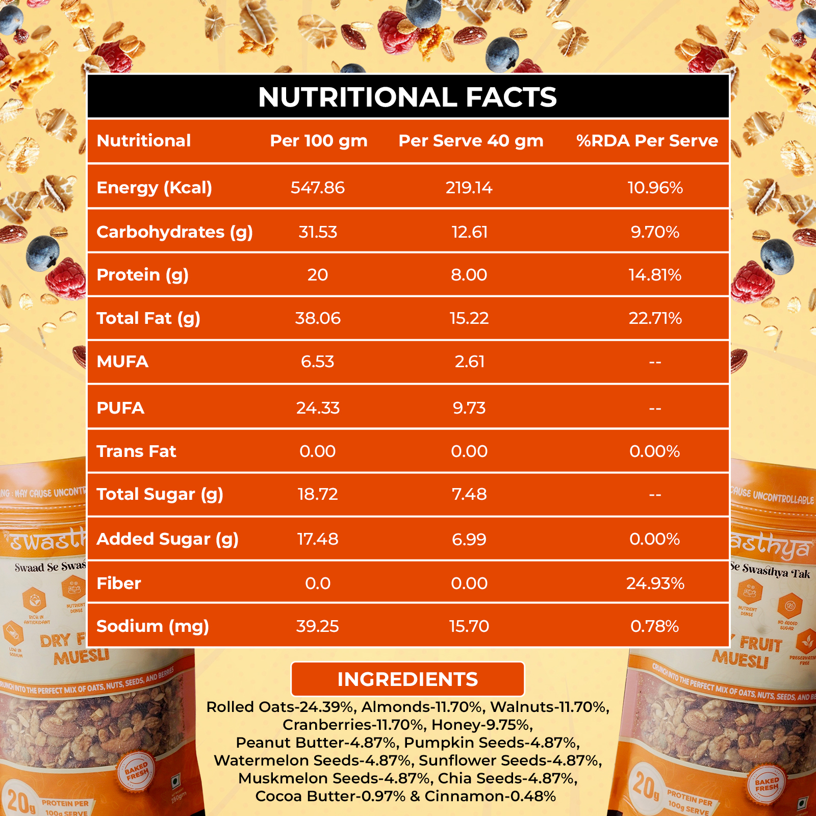 Whether you’re looking for a healthy breakfast, post-workout snack, or anytime pick-me-up, this Dry Fruit Muesli makes every bite count. Satisfy your hunger and nourish your body with real ingredients that feel just right.