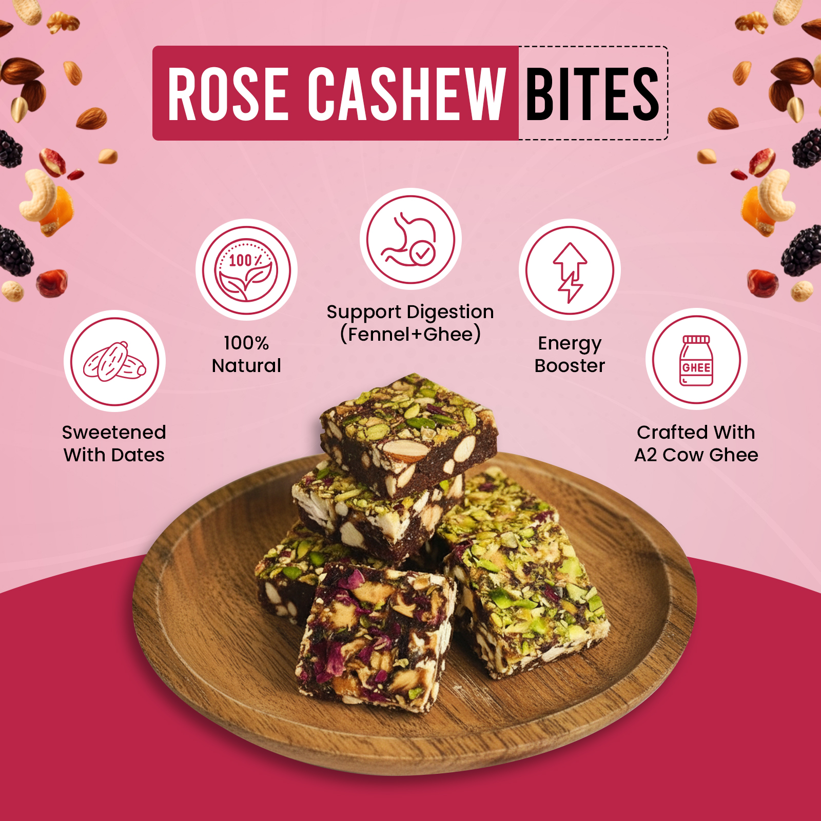 Experience the subtle elegance of our Rose Cashew Bites, where premium cashews meet the delicate aroma of real rose. Each bite is crafted with high-quality ingredients and a natural rose infusion that delivers a unique, fragrant flavour you’ll love. Free from artificial preservatives and refined sugar, these bites offer a cleaner, healthier alternative to ordinary snacks. Whether you’re enjoying them with evening tea, sharing with friends, or gifting to someone special, these Rose Cashew Bites add a touch of luxury to your snacking moments. Delight in a treat that’s gentle, delicious, and naturally wholesome.