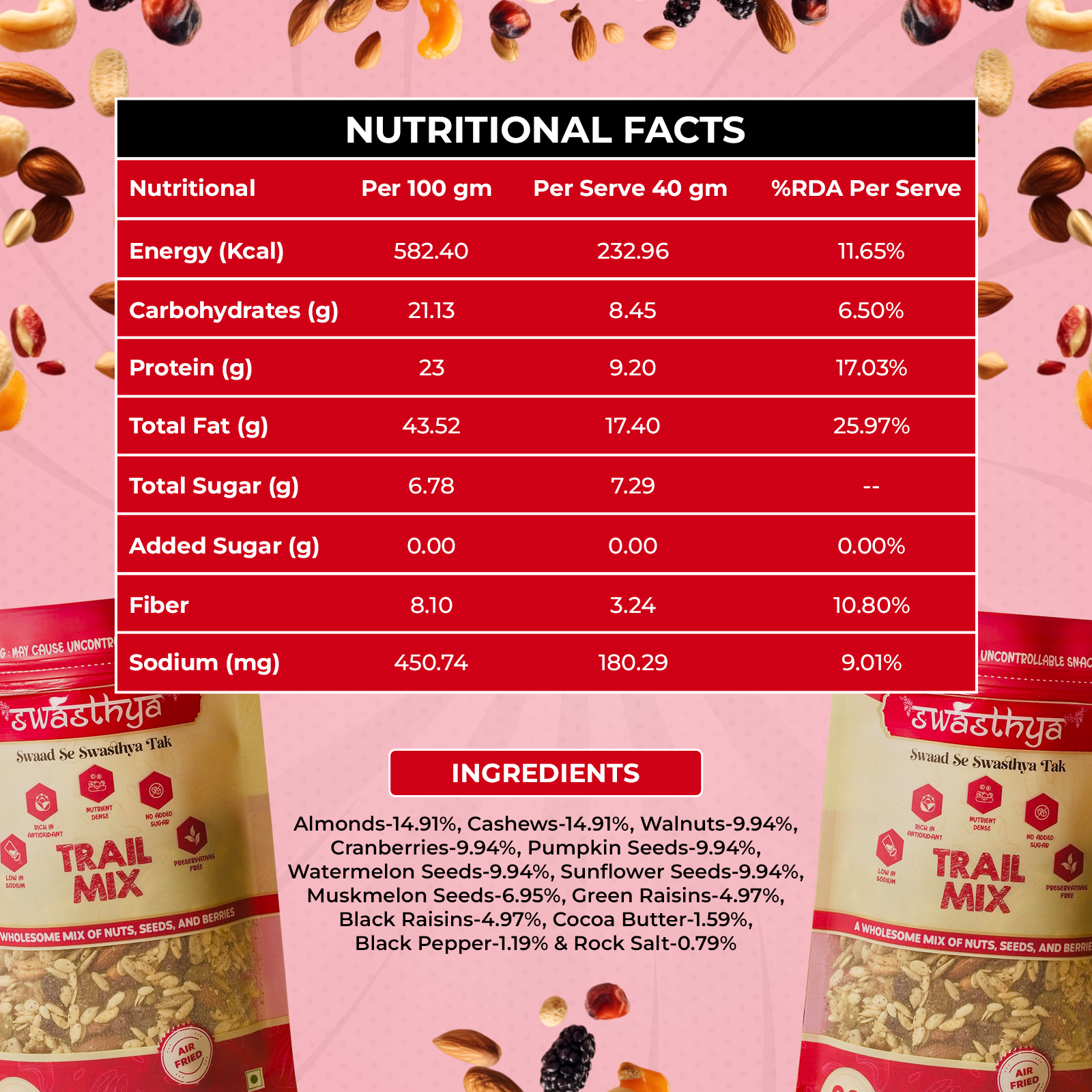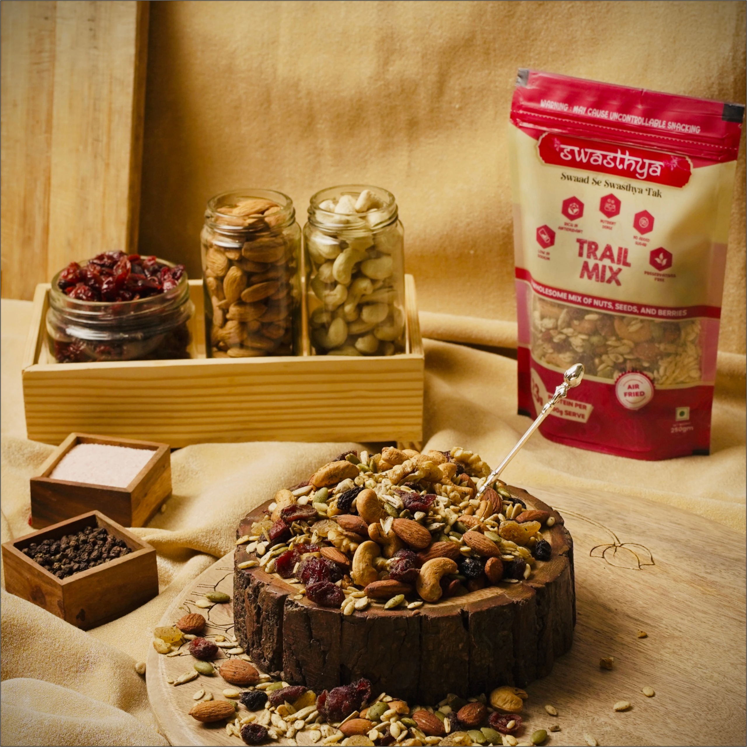 Discover the perfect balance of taste and nutrition with our Trail Mix, crafted with a premium blend of nuts, seeds, and dried fruits. Each handful delivers a satisfying crunch and natural energy, making it ideal for busy mornings, afternoon cravings, or outdoor adventures. Made without artificial preservatives and refined sugar, this mix provides a clean, wholesome snacking experience you can feel good about. Whether you’re at work, at the gym, or on the go, our Trail Mix keeps you fuelled and energized throughout the day. Enjoy the goodness of real ingredients, all packed into one delicious snack.
